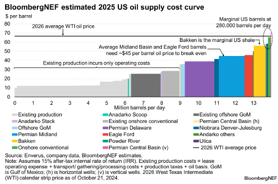 彭博新能源财经对2025年美国石油供应成本曲线的预测