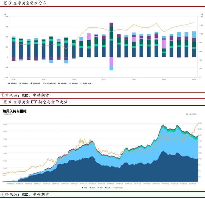 央行购金方面,根据WGC的统计数据,2024年上半年,全球央行的新增黄金购买量483吨,再创纪录新高,同比增长5%。2024年迄今为止,新兴经济体央行占全球央行净购买量的70%。WGC在今年6月下旬发布的《2024央行黄金储备调查》显示,29%的受访央行(本次调查共收到70家央行的回复)表示有意在未来12个月内增加黄金储备,创下2018年启动本项调查以来的最高水平。全球央行对黄金的持续购买是金价本轮上涨的主要推动力。