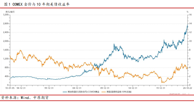 10月份以来,黄金价格先是经历一轮短暂调整,随后走势再度转强,并一路创出历史新高。目前市场交易的主要逻辑为国际地缘政治的不确定性,具体来看,一是临近美国大选最终投票日,随着选情的变化,特朗普的胜选概率有所上升,引发市场关于“特朗普交易”的情绪升温。考虑到特朗普上一任的政策偏向,大规模的减税和基础设施投资将对美国经济产生强劲的需求刺激,但贸易保护主义可能会加剧供给端紧张,进而推升通胀压力。因此,近期美元和黄金出现同步走强。二是近期中东、朝韩等地缘政治活动紧张,令市场避险情绪有所升温,进一步导致投资者涌向黄金等避险资产,以缓冲全球市场的风险和不稳定。