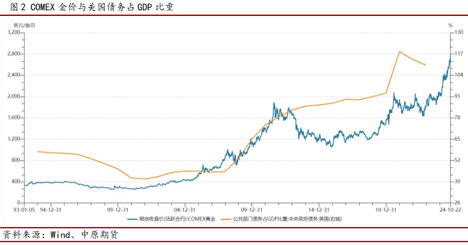 中长期来看,美联储9月份正式进入新一轮降息周期,美债收益率由强转弱,支持金价进入一轮上涨周期,这一点在美联储历次降息周期中都有验证。从另外一个角度来看,美国债务是否可持续一直是市场关注重点,如果债务压力持续增大,市场将倾向于将资产配置换成黄金等。美国财政部近期公布的数据显示,截至9月30日的本财年赤字为1.83万亿美元,高于上一财年的1.7万亿美元,是除2020和2021财年以外的最高纪录。美国国会预算办公室预计,公共债务占GDP的比例,将从2023年的98%上升到2053年的181%,这是该国历史上的最高水平。历史数据来看,美国债务与国内生产总值比率的上升历来导致金价上涨。