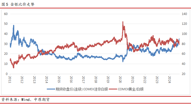 对于白银来说,历史多数情况下会追随黄金价格的走势,当金银比价过高时,白银的投资需求也会驱动投资者在黄金价格上涨过程中回补白银的多头。历史上,当发达市场的增长情绪走弱时,白银通常会迎来最强的牛市,如2009-2012年、2016-2017年、2020年等。这种情形下,常常意味着美元走弱、投资者对贵金属的配置增加、白银的工业需求增强。
