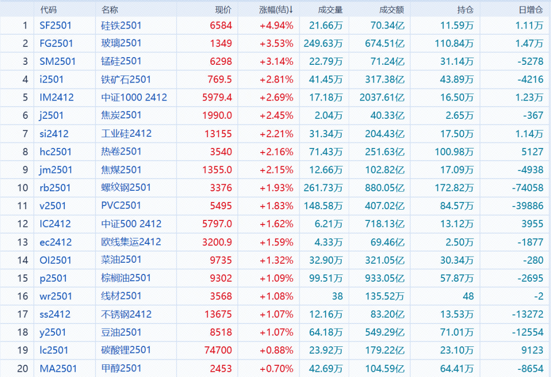 沪深300股指期货(IF)主力合约涨0.64%,上证50股指期货(IH)主力合约涨0.12%,中证500股指期货(IC)主力合约涨1.62%,中证1000股指期货(IM)主力合约涨2.69%。