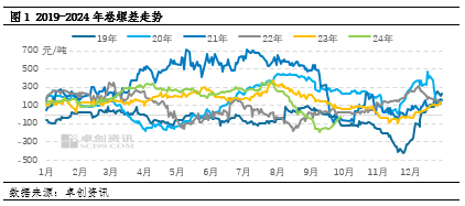 如图1,从2019-2024年上海地区现货卷螺差走势图中可以看到,在1月和12月,由于北方入冬,螺纹钢需求减少,价格表现往往卷强螺弱,卷螺差有走强趋势;而在6月前后,进入雨季降水增多,不利于下游施工,螺纹钢需求下降,卷强螺弱的概率大,卷螺差有走强趋势。卷螺差最有可能走弱的月份是4月或者9月前后,此时螺纹由于季节性需求旺盛,价格表现往往强于热卷。