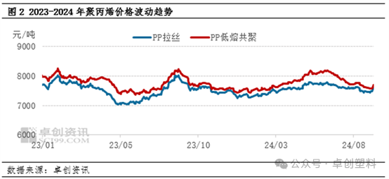 2024年三季度PP市场呈现震荡下行的趋势,在近5年的价格运行区间当中处于中性偏低水平,季度末一度突破最小值。从PP价格波动趋势来看,三季度PP价格从7月初的7760元/吨震荡走低至9月底的7585元/吨。均价来看,三季度华东地区PP拉丝均价在7600.45元/吨,较上一季度下跌0.69%,同比2023年三季度上涨1.11%;共聚主流市场均价在7833.33元/吨,较上一季度下跌1.37%,同比2023年三季度上涨1.29%。