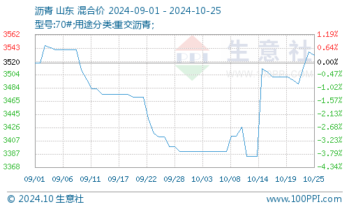 当前沥青处于消费旺季的卫生,现货的需求最后一波释放,在主产区炼厂维持低位开工的状态下,社会去库存顺利,少数工厂还出现短暂缺货状态,整体看各工厂库存状态低于去年同期,周内沥青市场稳中走高。据生意社分析系统,10月18日山东地区价格在3501元/吨,25日价格上涨至3533元/吨,涨幅0.9%。