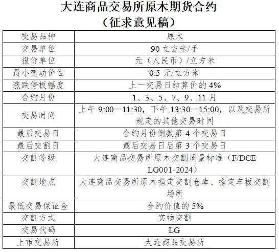 依据大商所发布的相关通知,拟上市交易的原木期货交易单位为90立方米/手,最小变动价位为0.5元/立方米,涨跌停板幅度为上一交易日结算价的4%,合约月份为1、3、5、7、9、11月,交易时间为9:00—11:30、13:30—15:00以及交易所规定的其他交易时间,最后交易日为合约月份倒数第4个交易日,最后交割日为最后交易日后第3个交易日。