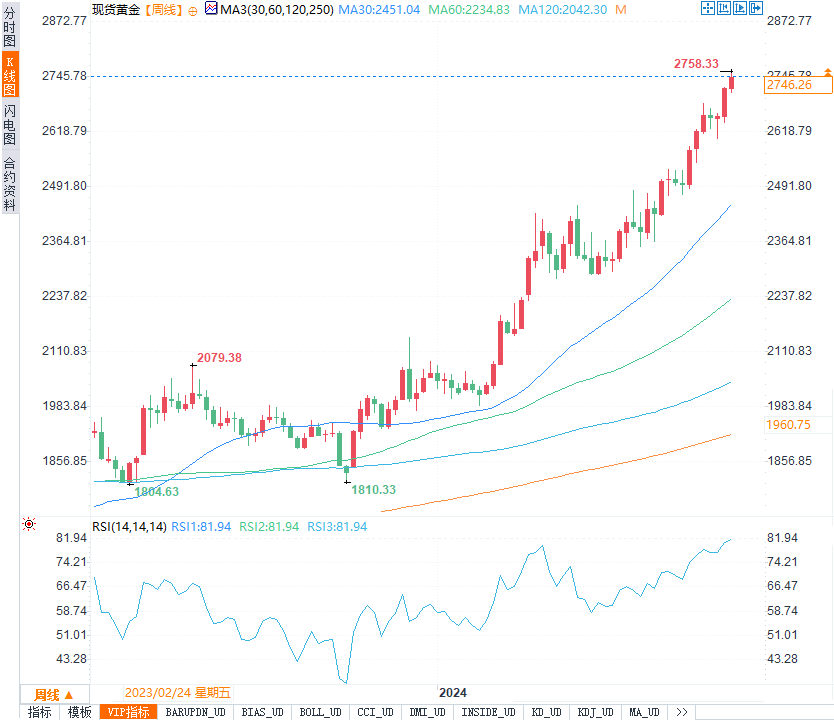 在本周的交易中,现货黄金呈现震荡上行的趋势,截止10月25日,黄金价格报每盎司2,747.38美元,本周累计上涨0.42%。周三,黄金价格更是触及历史高位2,758.37美元,连续第三周上涨。尽管金价本周中一度出现获利回吐的压力,但在避险情绪的支撑下价格迅速回升,并录得小幅涨幅。