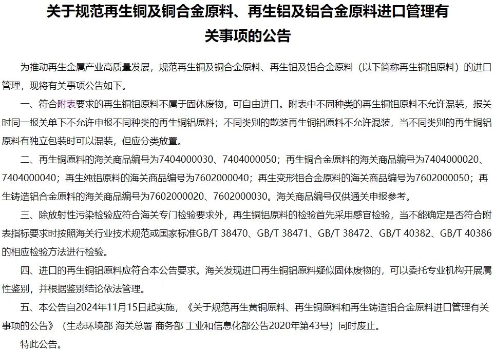 近日,生态环境部等六部门发布了《关于规范再生铜及铜合金原料、再生铝及铝合金原料进口管理有关事项的公告》(以下简称“公告”)。记者采访获悉,新政或有利于再生铜进口,满足国内废铜原料加工利用需求,缓解铜精矿供应不足对铜价造成的影响。