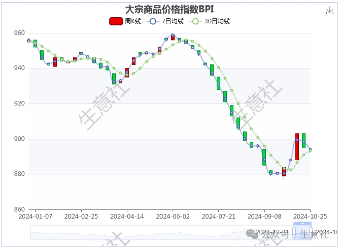 10月25日大宗商品价格指数BPI为894点,与周初持平,较周期内最高点1343点(2021-10-19)下降了33.43%,较年内最低点877点(2024-09-24)上涨了1.94%。