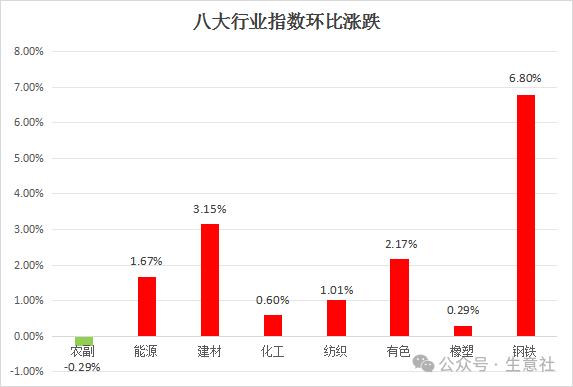 个行业,本周跌多涨少,上涨前三的分别是农副行业,涨幅为1.37%,能源行业,涨幅为0.55%,建材行业,涨幅为0.11%;下跌前三的分别是钢铁行业,跌幅为-0.90%,橡塑行业,跌幅为-0.71%,有色行业,跌幅为-0.49%。
