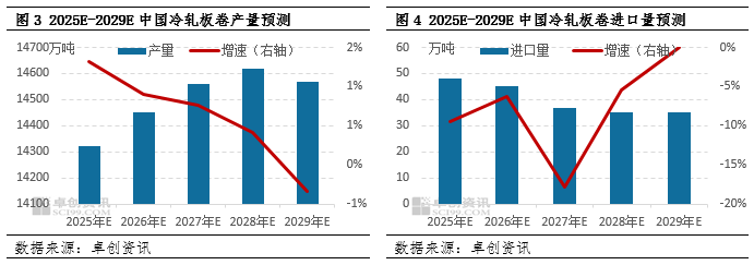 产量方面,预计未来五年冷轧板卷产量先增后降。虽然产能仍存继续增加可能,但下游需求增速或将放缓,基于行业以销定产的特性,同时根据冷轧板卷当下产能利用率表现以及末端产品盈利能力来看,预计2025年冷轧板卷产量继续增至14320万吨附近,2025-2029年产量震荡增至14570万吨附近。基于对全球宏观环境变化、产能基数扩大以及冷轧板卷盈利水平提升的预期,预计2025年冷轧板卷总供应量在14497.5万吨附近。