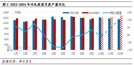 从月度产量来看,20234年各月产量同比去年增减互现。从波动规律来看,2024年冷轧板卷月度产量波动规律与往年较为一致,受传统春节假期影响2月为月产量低点。