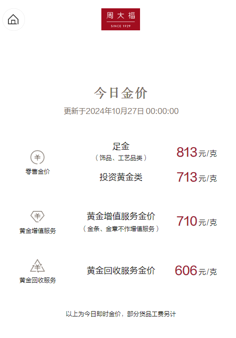 10月27日,国内黄金饰品价格再度回升,维持高位,周大福、老凤祥等多家金店黄金饰品报价813元/克,较26日上涨7元/克。