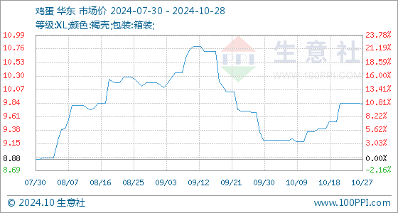 10月28日,生意社鸡蛋基准价为9.82元/公斤,与本月初(9.20元/公斤)相比,上涨了6.74%。