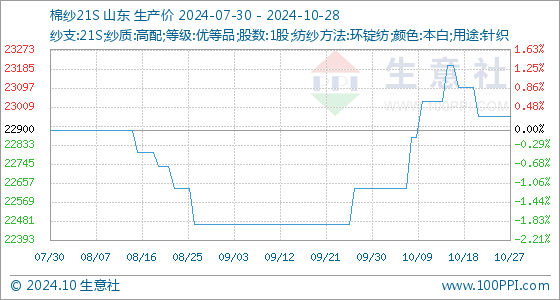 10月28日生意社棉纱21S基准价为22966.67元/吨
