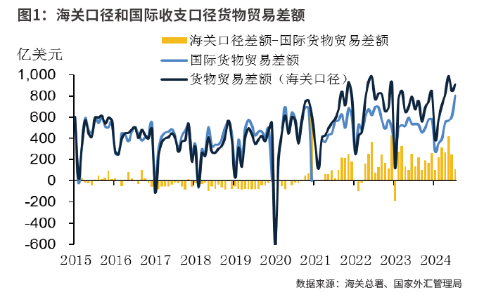 海关口径和国际收支口径的贸易顺差存在差异。自2021年以来,海关和国际收支口径贸易顺差的差值不断扩大。根据国家外汇管理局国际收支分析小组的研究,这主要源于统计原则、计价方法的不同。