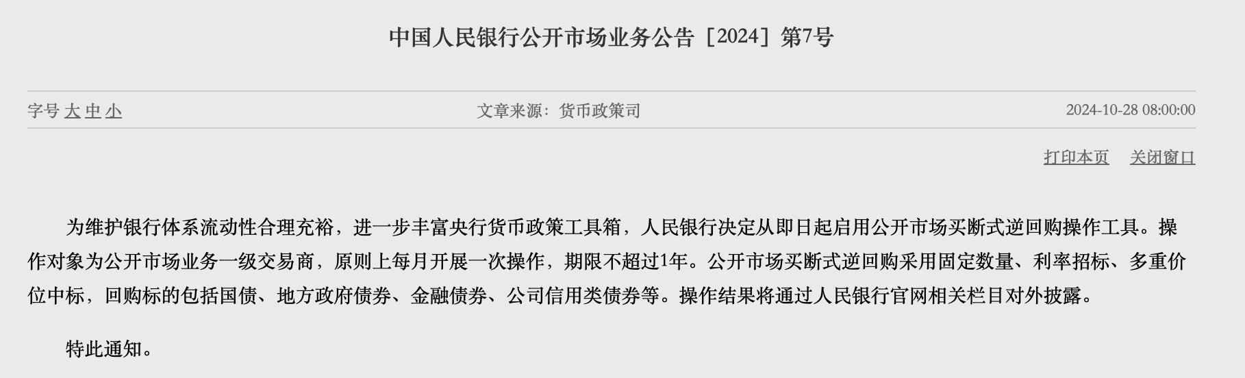 10月28日,中国人民银行(下称“央行”)发布公告,为维护银行体系流动性合理充裕,进一步丰富央行货币政策工具箱,人民银行决定从即日起启用公开市场买断式逆回购操作工具。操作对象为公开市场业务一级交易商,原则上每月开展一次操作,期限不超过1年。