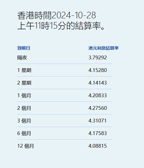 10月28日,港元拆息多数偏软,其中,隔夜拆息结束两连升,报3.79292%,而与楼按相关的一个月拆息亦微降3基点至4.20833%,为9月27日后最低。