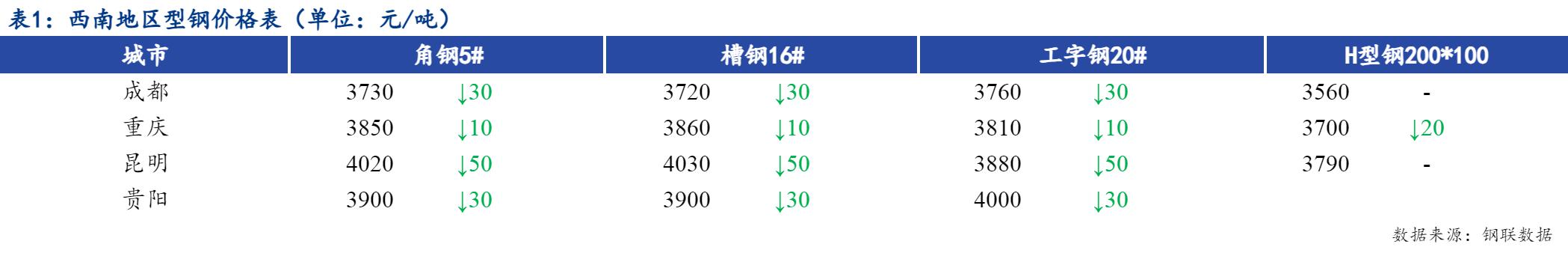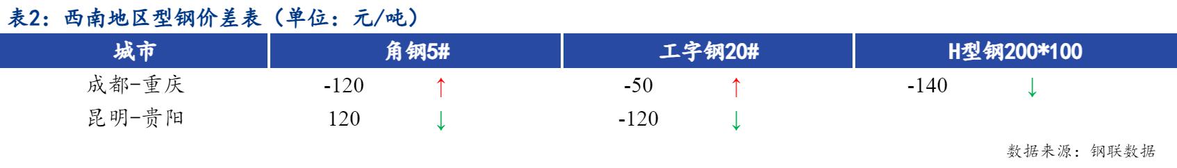 成都与重庆角钢价差扩张,工字钢价差扩张,H型钢价进一步差收窄;昆明和贵阳角钢价差收窄,工字钢价差价差扩收窄。
