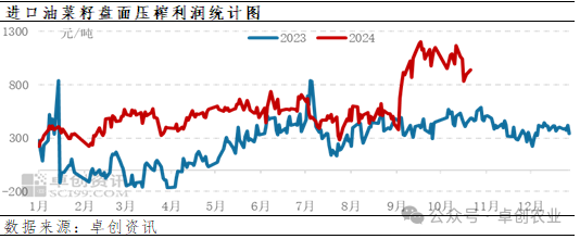 本周国内油菜籽产业链各产品价格走势不同,国际市场利多因素明显,国际原油和国际油脂油料价格纷纷上涨,加拿大油菜籽价格同样震荡上行,国内进口油菜籽到港成本环比增加。本周国内菜籽油和菜粕市场价格波动幅度较大,对应月份期货价格均值较上周相比均有所下跌。综合来看,本周国内进口油菜籽盘面压榨利润均值较上周相比有所减少。本周进口油菜籽盘面压榨利润均值为918元/吨,较上周相比减少154元/吨,减幅为14.37%。