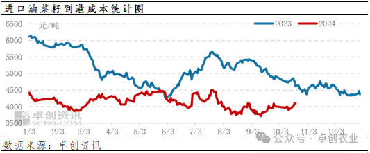总体来看本产业链供大于求格局较为明显,各产品之间价格传导并不顺畅顺畅。本周国际市场利多因素增多,加拿大油菜籽价格整体呈现震荡上涨走势,国内进口油菜籽到港成本均值因此增加。据卓创资讯统计,本周进口油菜籽到港成本均值为4042元/吨,较上周相比增加89元/吨,增幅为2.25%。