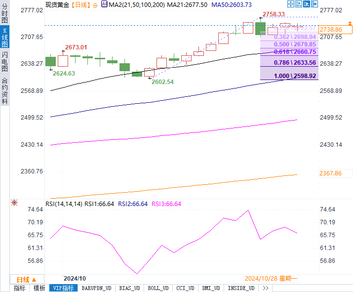 1.支撑位:当前市场的主要技术支撑位聚焦于2723美元/盎司,这是10月10日低点2604美元/盎司至历史高点2759美元/盎司反弹走势的23.6%斐波那契回撤水平。若金价无法守住2723美元/盎司的关键支撑位,下一步目标为38.2%斐波那契支撑位,即2700美元/盎司。此处的支撑可能较强,同时也受到市场交易者的关注。再往下看,Mehta指出50%斐波那契支撑位在2681美元/盎司,恰好位于21日简单移动平均线附近,这一支撑位一旦被挑战,可能会引发更深度的回调。