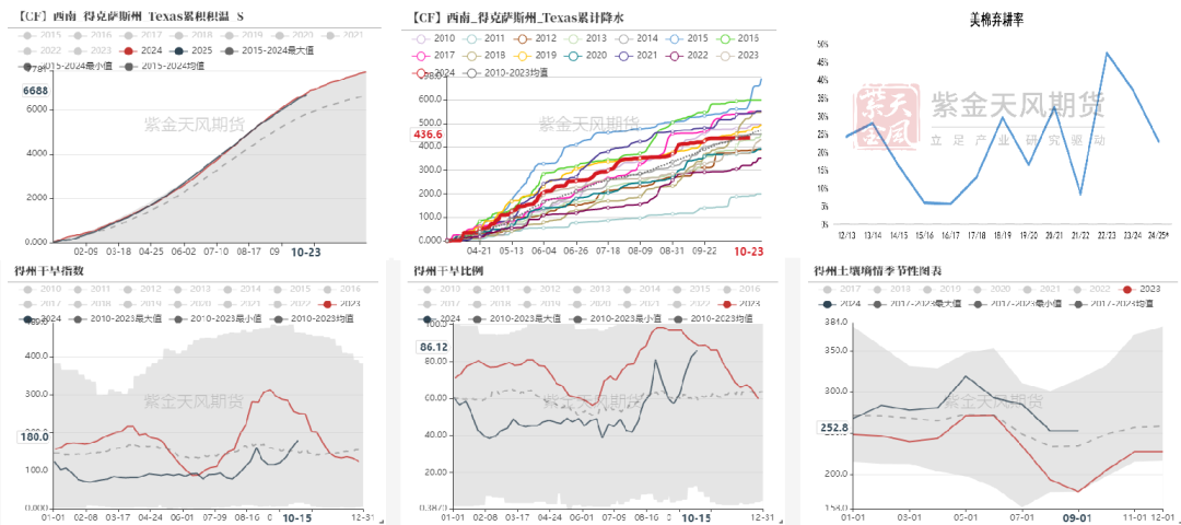 截止到10月15日,美棉主产区(92.8%)的干旱程度和覆盖率指数138,同比低68,环比上周升13;德克萨斯州的干旱程度和覆盖率指数为180,同比低70,环比上周升20。