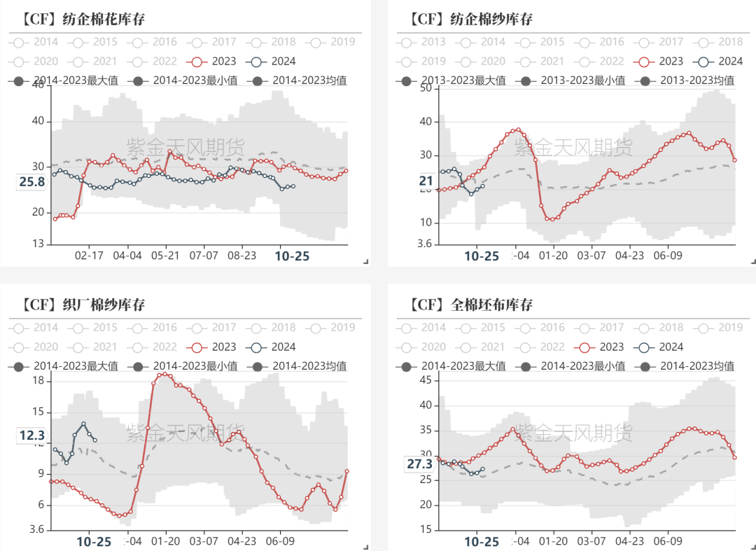 截至10月25日,纺纱厂原料库存为25.8天,稳中小升,随买随用为主。成品库存21天,累库。织布厂棉纱库存为12.3天,当前以消耗库存为主,随买随用。织布厂全棉坯布成品库存27.3天,成品累库。