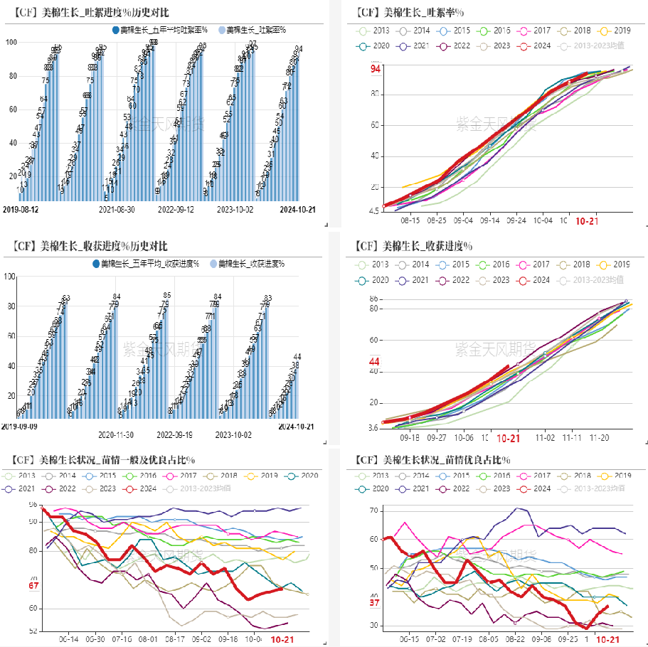 美棉收割率为44%,前周为34%,去年同期为39%,五年均值为38%。