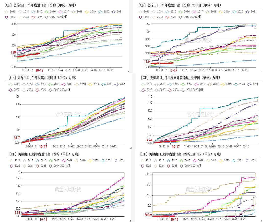 据美国农业部(USDA)报告显示,2024年10月11-17日,2024/25年度美国陆地棉出口签约量38522吨,较前周增长6%,较前4周平均水平增长57%,主要买家越南(7763吨)、巴基斯坦(7673吨)、中国(6243吨,包括取消1090吨)、土耳其(5857吨,包括从中国转口2043吨)。