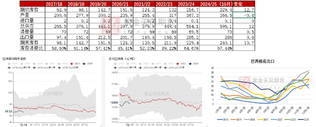 新年度种植预期:中性偏空USDA10月报告,全球方面,2024/25年度全球棉花产量调增、贸易调减,整体期末库存受期初库存调整影响而调减,影响中性;美棉产需双降,影响偏空。中国产量调增,进口调减,整体影响中性。