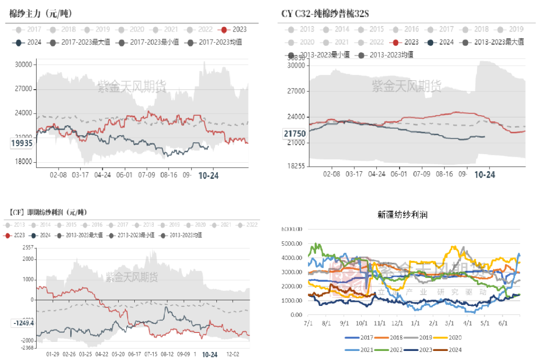 随着前期纺纱亏损扩大,内地纺企现金流即期亏损1250元/吨,新疆纺纱利润在1460元/吨。