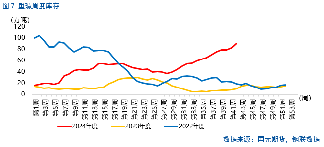 需求及库存:纯碱出货量下滑,截至10月17日,中国纯碱企业出货量65.72万吨,环比下跌5.47%;纯碱整体出货率为90.04%,环比减少4.89个百分点。纯碱厂库整体呈现积累。轻重碱库存表现延续分化,重碱连续累库14周,持续创年内新高。截至10月17日,国内纯碱厂家总库存160.13万吨,较周一增加1.24万吨,涨幅0.78%。其中,轻质纯碱69.69万吨,环比减少0.47万吨,重质纯碱90.44万吨,环比增加1.71万吨。
