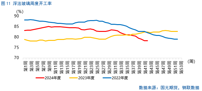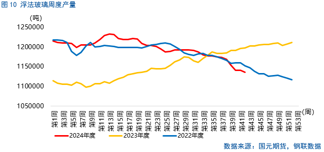 浮法玻璃供应:浮法玻璃冷修逐步增加,产量居于近三年同期低位。截至10月17日,浮法玻璃行业产能利用率为80.53%,比10日下滑0.3个百分点;浮法玻璃行业平均产能利用率80.57%,环比下滑0.3个百分点;浮法玻璃日产量为16.22万吨,比10日下跌0.37%。浮法玻璃周产量113.59万吨,环比下跌0.37%,同比下跌5.15%。
