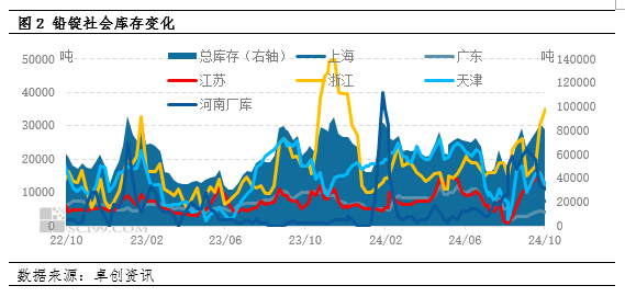 1、供应恢复,社会库存累库明显,铅价承压。原生铅市场,10月多数炼厂维持正常生产状态,个别地区炼厂技改后复产,10月电解铅供应量小幅增加,炼厂集体在月中交仓,社会库存开始上升,并运行至高位水平。再生铅方面,炼厂复产与停产并存,湖南地区有部分炼厂检修后于本周复产,河北地区、湖北地区有炼厂复产,新疆地区有炼厂停产,产量增减相抵,再生铅行业开工率略有回升。