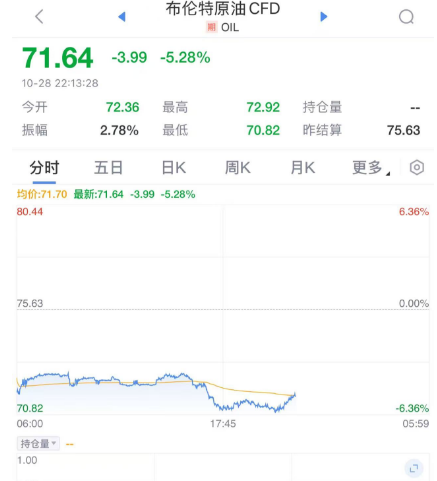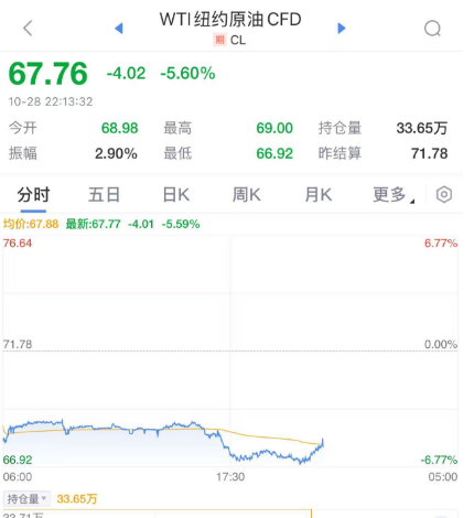 截至发稿,布伦特原油期货指数下跌约5.3%,至每桶71.64美元,有望创下自2023年3月以来的最大单日跌幅。美国西德克萨斯中质原油(WTI)期货指数下跌5.6%,至每桶67.76美元。
