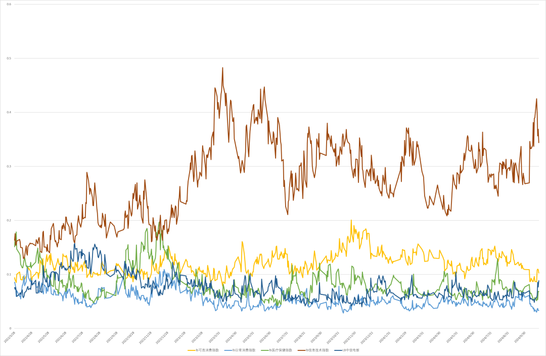 新经济行业成交占比中信息技术板块交易过于拥挤,成交占比高位回落,新能源开始大幅回升,可选消费、日常消费和医疗保健小幅回升。