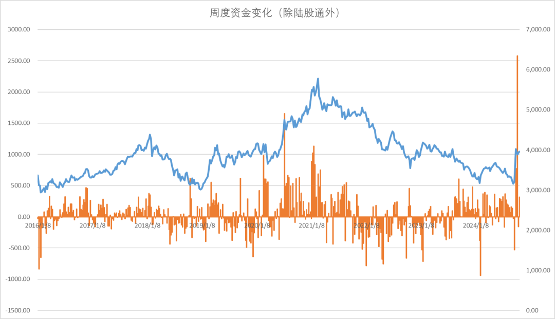 上周资金面除陆股通外显著流入,主要是两融大幅增加,融资余额已经接近2023年最高点,ETF基金连续两周转向流出,部分资金获利减仓。产业股东减持有所增加,回购金额减少,IPO继续低迷。