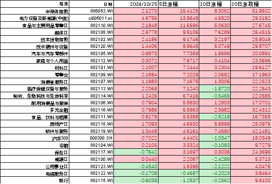 核心观点:中性 市场整体处于震荡当中,接近国庆节前高点,很难向上突破,回落的概率较高。一方面是前期套牢盘高达10万亿,短期后续资金显然不够解放所有套牢盘。另一方面是美国大选倾向于特朗普,中国面临二次压力,美债利率继续高涨,中国短期政策增量牌已经打完。后续至少要等待美国大选结束后才会有新政策。信息技术板块短期交易过于拥挤,有调整的需要。工业企业利润下滑明显,不支持蓝筹股发力,但有利于A股继续偏向成长股的交易结构。
