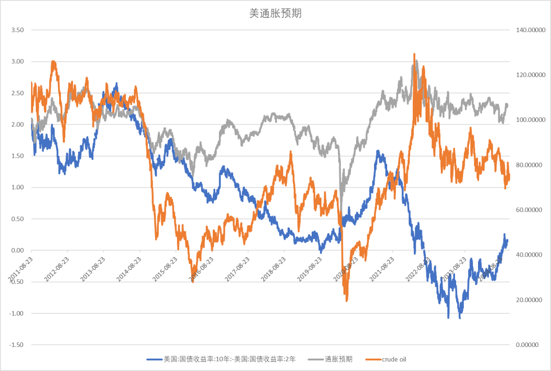 美国十年期国债与两年期国债利差转正,原油反弹,美国通胀预期反弹。