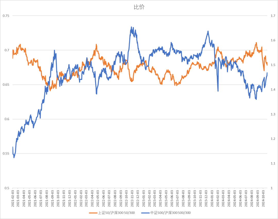 中证500与沪深300的比值反弹,量比处于处于高位,上证50与沪深300比值中性。中小盘股成交有些偏热。