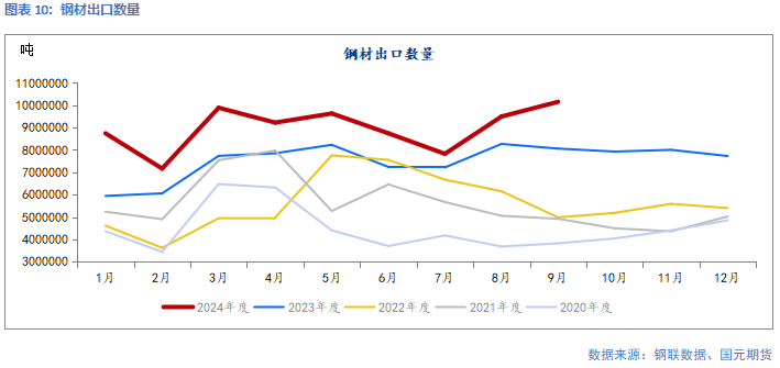 出口方面,9月中国出口钢材1015.3万吨,较上月增加65.8万吨,环比增长6.9%;1-9月累计出口钢材8071.1万吨,同比增长21.2%。近日韩国对中国热轧或合金中厚板发起反倾销调查。根据中国海关数据,近年来中国出口至韩国涉案产品数量在130-140万吨左右。在逆全球化加强的背景下,钢材出口增量预计难延续。