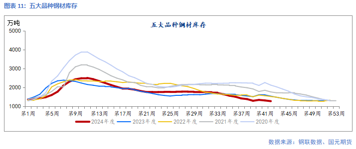 上周,五大品种钢材总库存1272.55万吨,周环比下降37.55万吨。其中钢厂厂内库存增加1.09万吨,社会库存减少38.64万吨。螺纹库存427.08万吨,环比减少13.77万吨;热卷库存369.84万吨,环比减少13.46万吨。