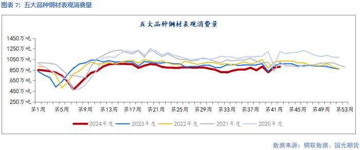 上周五大品种钢材表观消费量为910.97万吨,周环比增加18.14万吨。其中螺纹表需为257.84万吨,周环比增加9.34万吨。热卷表需318.75万吨,周环比增加2.79万吨。