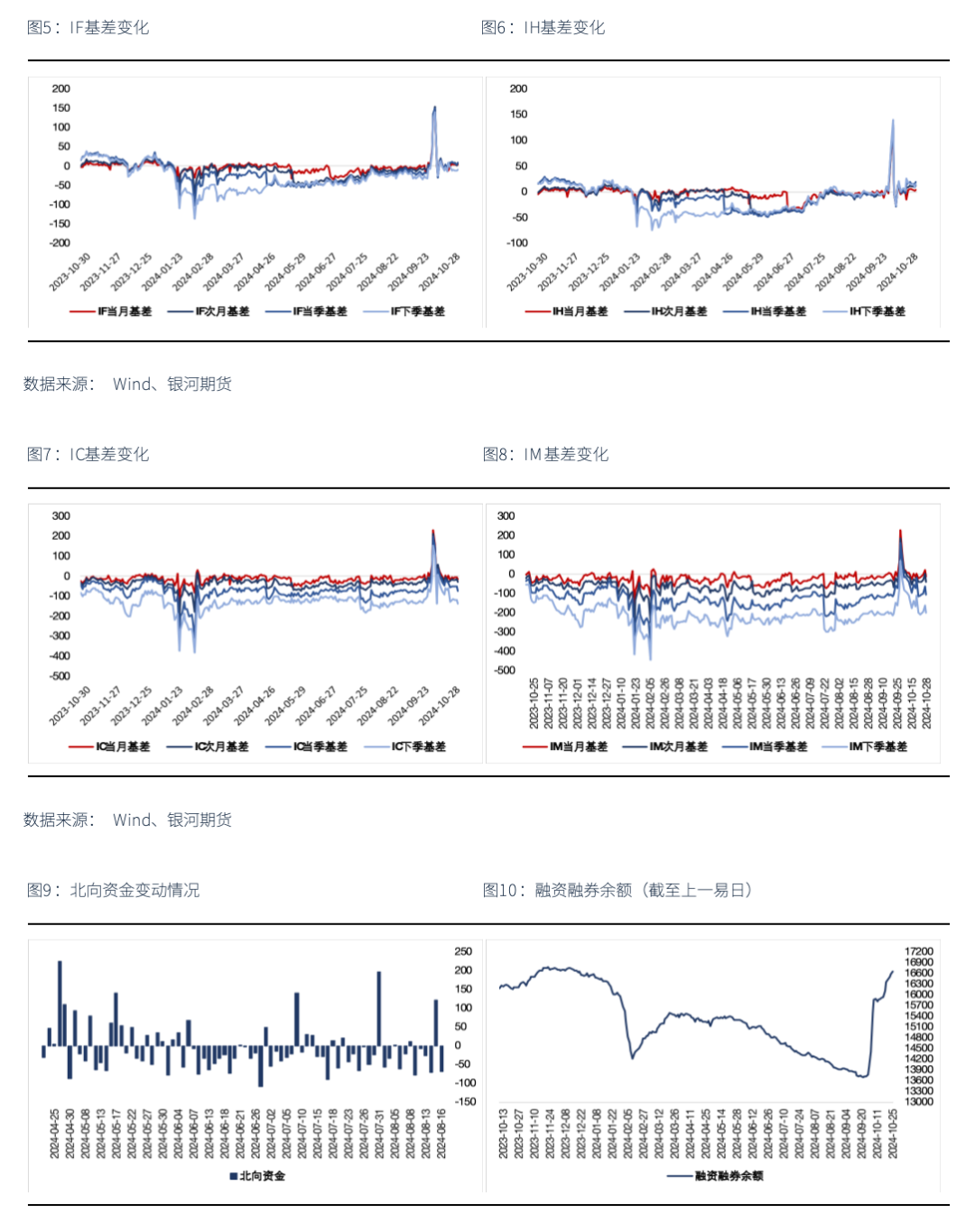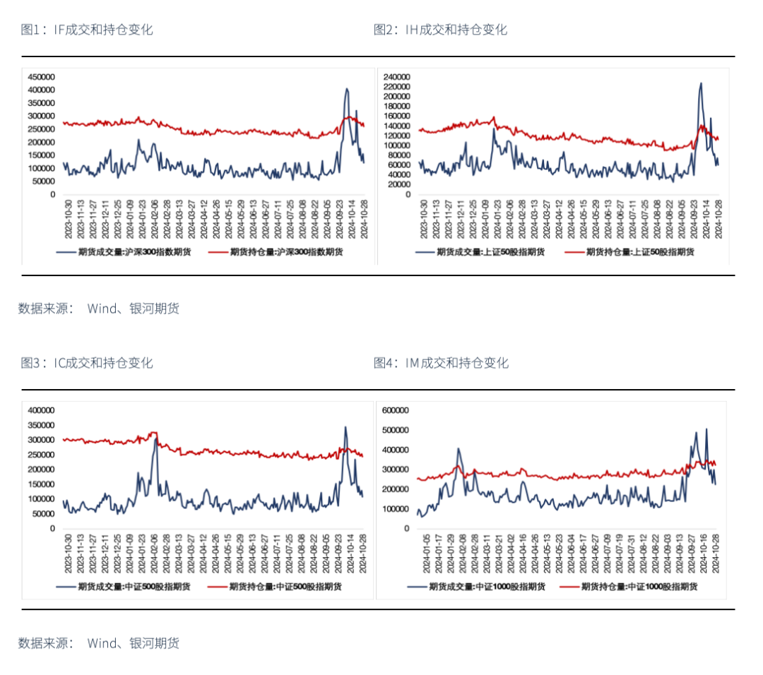 股指期货全线上涨,至收盘,主力合约IH2412涨0.22%,IF2412涨0.3%,IC2412涨1.15%,IM2412涨1.61%。基差表现分化,IC和IM贴水扩大,IF和IH升水则小幅上升。市场波动下降,IC、IF、IH和IM成交分别下降15%、23%、18%和25%。IC、IF、IH和IM持仓分别下降4.4%、4.5%、5.2%和6.5%。