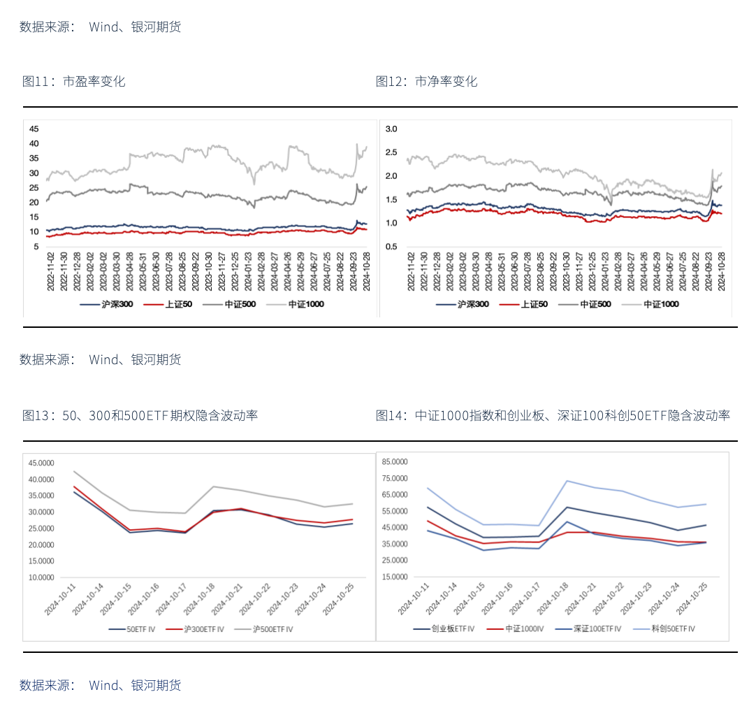 期权方面,尽管期权标的普涨,但期权成交量并没有如9月底和10月初那般大幅上行。10月合约到期后,期权市场交投热情有所回落。隐波方面,所有品种隐波小幅反弹,标的与隐波走势继续维持正相关。近期标的日间实际波动和日内振幅偏高,预计各个品种隐波将维持高弹性。