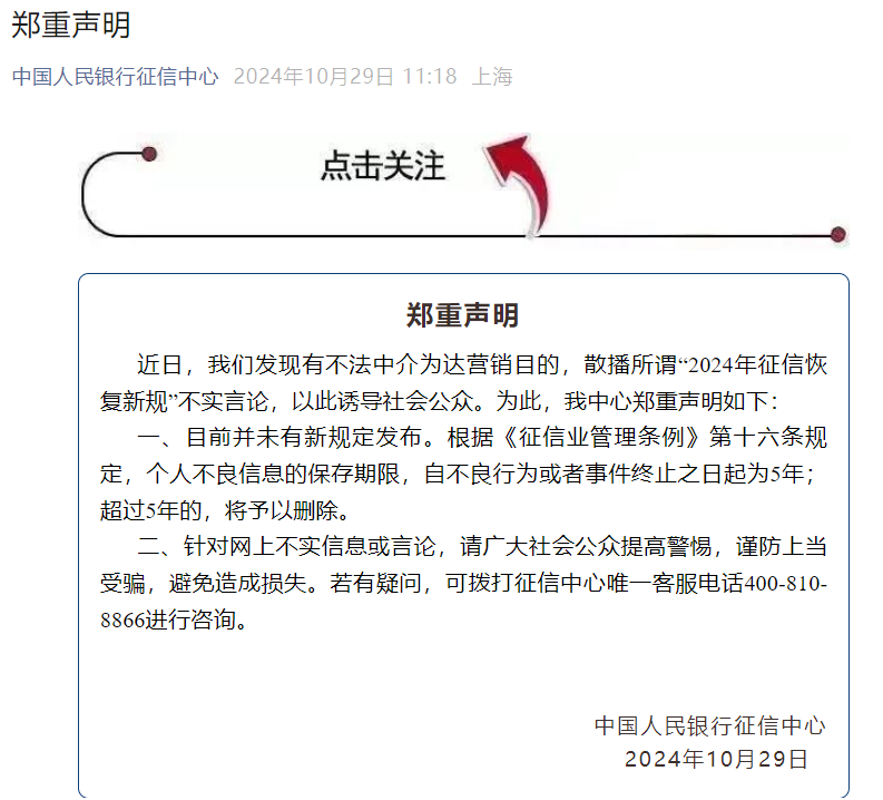 中国人民银行征信中心10月29日发文称,近日有不法中介为达营销目的,散播所谓“2024年征信恢复新规”不实言论,以此诱导社会公众。为此,中国人民银行征信中心郑重声明如下: