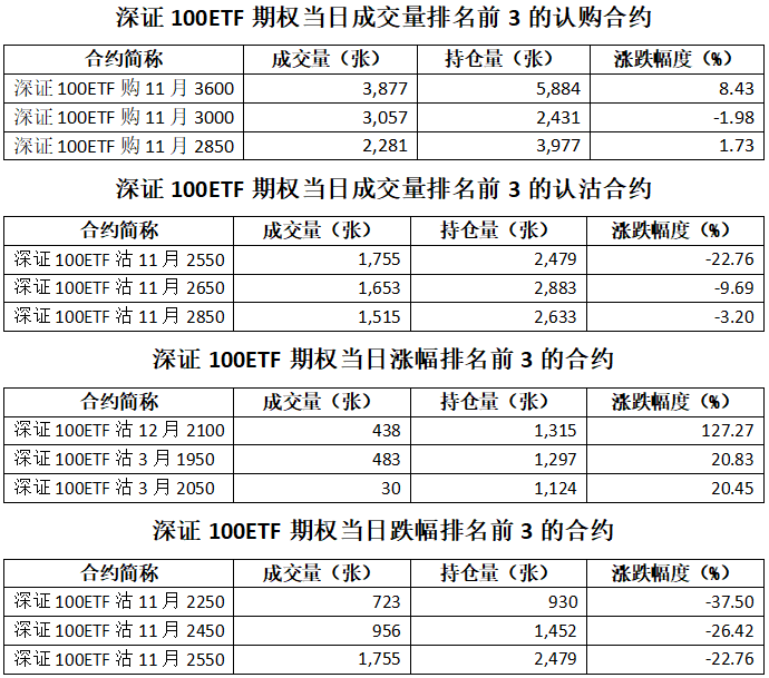 深证100ETF期权总成交面额12.20亿元,减少19.55%,期现成交比为0.01,权利金成交额0.29亿元;期权总成交量42,783张,减少18.96%,其中认购期权成交量23,341张,认沽期权成交量19,442张,认沽认购成交比率为0.83(上一交易日认沽认购成交比率为0.70)。