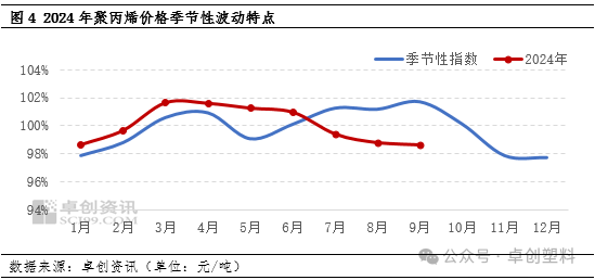但从2024年聚丙烯价格运行趋势来看,PP价格在5、6月份出现反季节性上涨,3季度则出现反季节性下跌。PP价格打破季节性波动规律,归根结底还是阶段性供需错配。5、6月份价格出现反季节性的上涨,一方面在于5、6月份PP检修装置较往年集中,且损失量远高于往年同期,因此,供应并不宽裕;另一方面,5月份宏观政策集中释放,扭转了市场悲观情绪及对需求偏弱的预期,参与者心态受到提振而令PP价格连续上调,虽然6月份实际需求放量不足令价格上行节奏放缓,但环比依然保持上行的态势。3季度价格出现反季节性下跌,一方面在于3季度政策面提振不足,市场预期落空。虽然9月底在美联储降息及国内降准降息等利好消息释放下,市场价格有所恢复,但持续性欠佳。另一方面,8月下旬-9月份季节性需求并未体现出来,实际需求不足拖累了市场价格。整体上,年内价格运行在多个月份打破季节性规律,呈现“淡季不淡”,“旺季不旺”的特点。