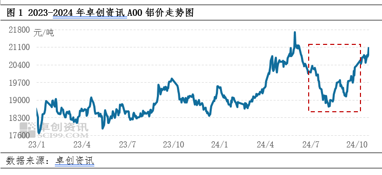 2024年三季度,铝价整体先跌后涨,期间经历短期走高和回调,呈现出“W”走势,均价较二季度下跌。据卓创资讯数据显示,国内现货A00铝价三季度均价为19544元/吨,环比二季度下跌4.74%,同比去年同期上涨3.84%。三季度高点为9月30日的20370元/吨,低点为8月6日的18750元/吨,高低价差达1620元/吨。